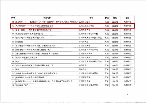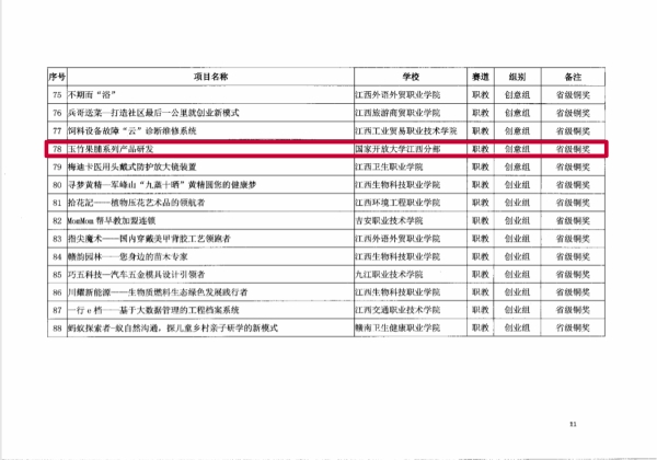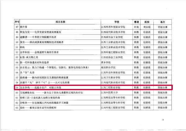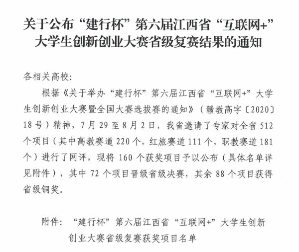 8月5日,江西省高等院校毕业生就业工作办公室下发《关于公布“建行杯”第六届江西省“互联网+”大学生创新创业大赛省级复赛结果的通知》,永利官网由新余电大选送的“玉竹果脯系列产品研发”项目和由高职学院选送的“‘点绿成金’——探寻乡村生态旅游致富蓝海”项目分别获得职教赛道和红旅赛道省级铜奖,由高职学院选送的“百农争鸣——连接小农户 对接大市场”项目晋级全国决赛。