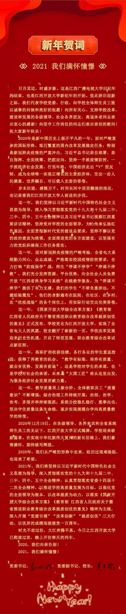 日月其迈,时盛岁新。这是江西广播电视大学旧纪年的结束,也是ylzzcom永利总站线路检测新纪年的开始。值此辞旧迎新之际,我们代表学校党委、行政,向学校全体师生员工致以诚挚的问候和美好的祝愿!向所有关心、支持学校改革、建设和发展的各级领导、社会各界朋友、离退休老同志表示衷心的感谢!向坚守工作岗位的同志们表示亲切的慰问!祝大家新年快乐!