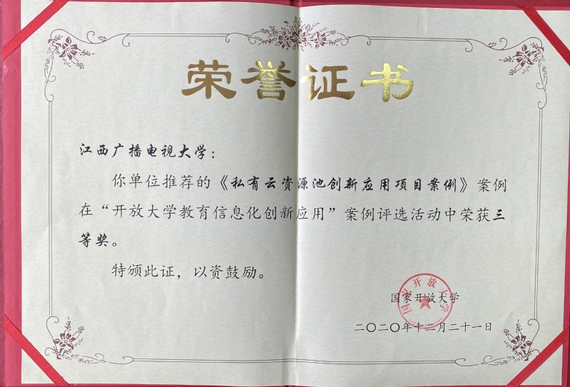 近日,国家开放大学公布开放大学教育信息化创新应用案例评选结果,永利官网报送的《私有云资源池创新应用项目案例》荣获三等奖。据悉,本次活动共收到110个信息化创新应用案例,经过专家评审,最终确定一等奖5个、二等奖10个、三等奖17个、优秀案例奖10个、组织奖单位6个。活动旨在探索先进信息技术在开放教育中的创新应用,推进线上线下融合的开放教育不断蓬勃发展。(文字:徐星星 图片:现代教育技术中心 责任编辑:张睿)