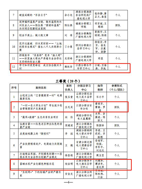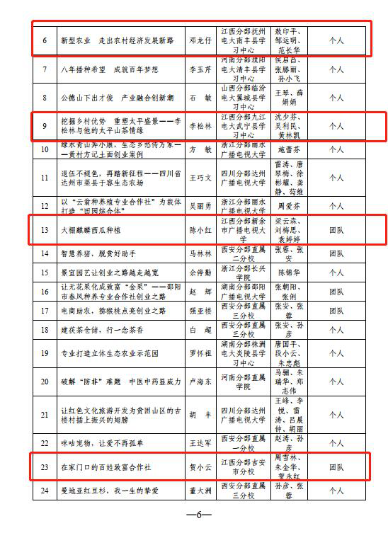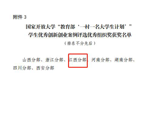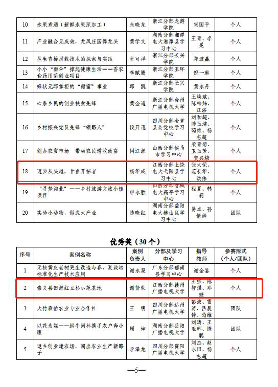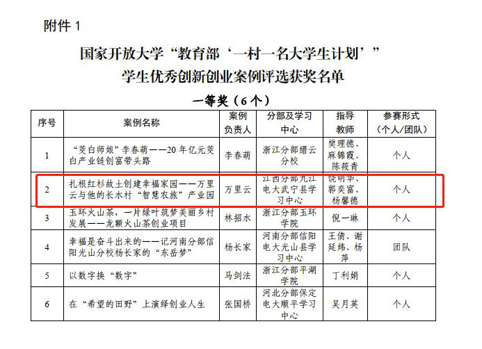 近日,国家开放大学公布国家开放大学“教育部‘一村一名大学生计划’”学生优秀创新创业案例评选结果,永利官网学生申报的案例获得一等奖1名,二等奖1名,三等奖3名,优秀奖5名。其中,万里云《扎根红杉故土创建幸福家园——万里云与他的长水村“智慧农旅”产业园》荣获一等奖,魏秋香《学习知识改变命运 成立协会振兴乡村》荣获二等奖,庄毛英《“一村一名大学生计划”学生返乡创业带领贫困户发展致富》、杨业明《富硒水稻产业化绿色种植示范》、杨华成《迈步从头越,甘当开拓者》荣获三等奖,谢贤荣《崇义县田源红豆杉示范基地》、邓龙仔《新型农业 走出农村经济发展新路》、李松林《挖掘乡村优势重塑太平盛景——李松林与他的太平山茶情缘》、陈小红《大棚麒麟西瓜种植》、贺小云《在家门口的百姓致富合作社》荣获优秀奖。永利官网教师饶明华等29人获得优秀指导教师称号,永利官网获得优秀组织奖。