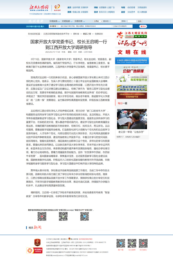 3月15日,国家开放大学(国家老年大学)党委书记、校长王启明,党委委员、副校长范贤睿来校调研指导。省民政厅党组书记、厅长李明生,省委教育工委委员、省教育厅副厅长王勇参加调研。ylzzcom永利总站线路检测党委书记贺瑞虎,党委副书记、校长黄平槐陪同。
