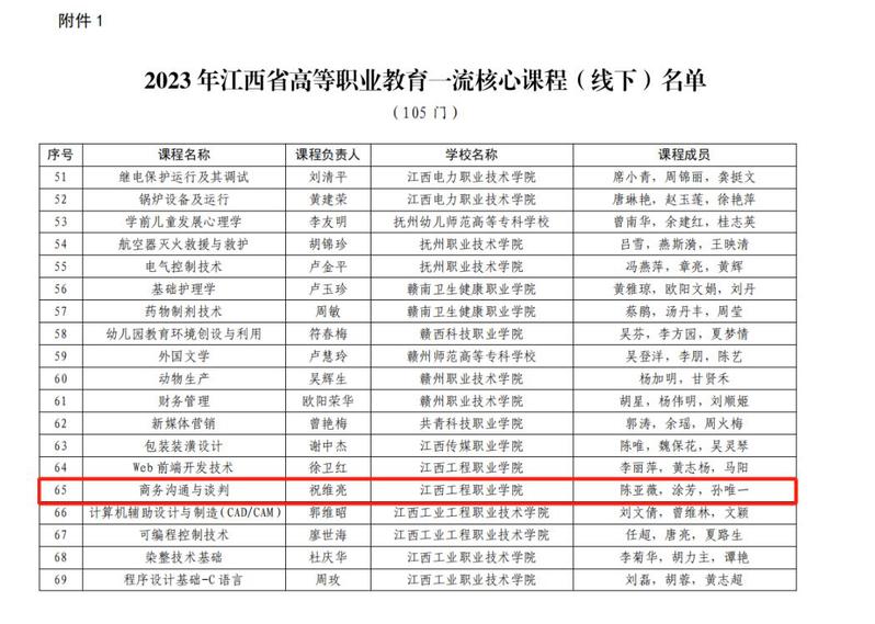 近日,由江西省教育厅印发《关于公布2023年江西省职业教育一流核心课程(线下)认定结果的通知》(赣教职成办函〔2023〕34号),我院祝维亮教授课程团队的《商务沟通与谈判》课程被认定为2023年江西省职业教育一流核心课程(线下)。