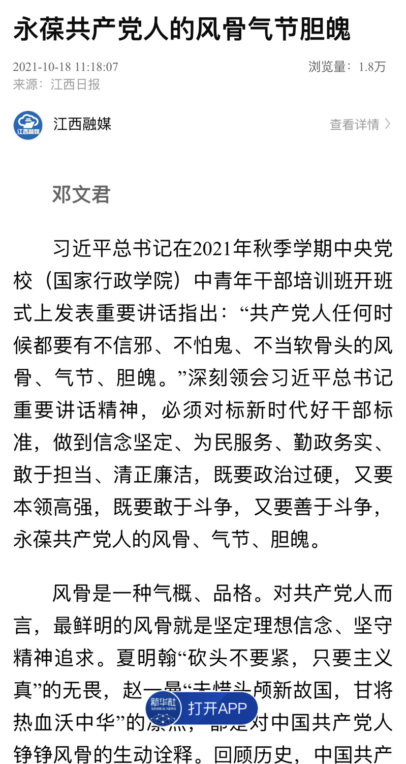 邓文君在江西日报发表文章 《永葆共产党人的风骨气节胆魄》