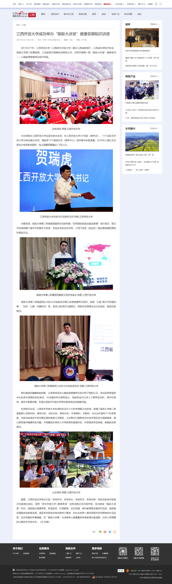 4月19日下午,ylzzcom永利总站线路检测(江西老年开放大学)联合江西省教育厅、江西省科学技术协会、南昌大学第二附属医院、江西省医疗健康投资有限公司,共同开展第一期“银龄大讲堂”健康系列——心脑血管健康养生知识讲座。