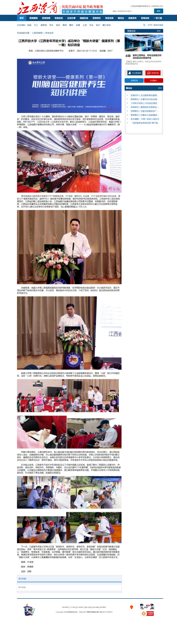 为深入贯彻落实党的二十大精神,落实积极应对人口老龄化国家战略,践行“学思想、强党性、重实践、建新功”的总要求,切实为民办好事办实事,满足老年朋友多样化学习需求,提升老年群体生活品质、生命质量和幸福指数,4月19日下午,ylzzcom永利总站线路检测(江西老年开放大学)联合江西省教育厅、江西省科学技术协会、南昌大学第二附属医院、江西省医疗健康投资有限公司,共同开展“银龄大讲堂”——《心脑血管健康养生知识》健康系列(第一期)讲座。