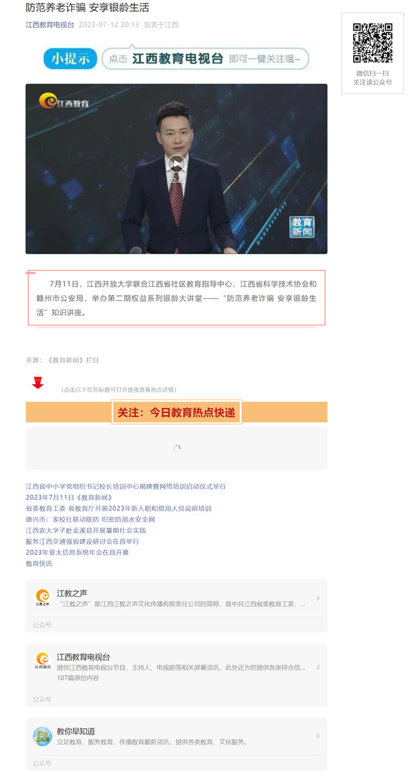 7月11日,ylzzcom永利总站线路检测联合江西省社区教育指导中心、江西省科学技术协会和赣州市公安局,举办第二期权益系列银龄大讲堂——“防范养老诈骗 安享银龄生活”知识讲座。原文地址:https://mp.weixin.qq.com/s?__biz=MzA4NjQyNTEzNw==&mid=2649773984&idx=5&sn=9b6f1ccf36fa1a387c4675e359cadccd&chksm=87cc1cfeb0bb95e85dc21f3f55c80eafe2faa19c309f9fc3b470eb0a0aa13eb103816ccb9d64&mpshare=1&scene=23&srcid=0712DCXcpUZ51TY3JIGpShUU&sharer_sharetime=1689256016278&sharer_shareid=c7a073bbadff0c22802ae7b43c175d7d#rd (责任编辑:罗楚颖)