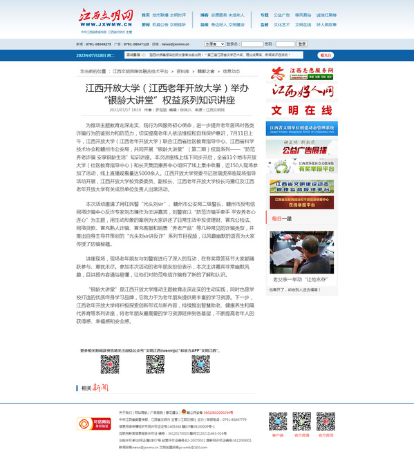 为推动主题教育走深走实、践行为民服务初心使命,进一步提升老年居民对各类诈骗行为的鉴别力和防范力,切实提高老年人依法维权和自我保护意识,7月11日上午,ylzzcom永利总站线路检测(江西老年开放大学)联合江西省社区教育指导中心、江西省科学技术协会和赣州市公安局,共同开展“银龄大讲堂”(第二期)权益系列——“防范养老诈骗 安享银龄生活”知识讲座。本次讲座线上线下同步开启,全省11个地市开放大学(社区教育指导中心)和长天集团康养中心组织了线上集中收看,近150人现场参加了活动,线上直播观看量达5000余人。ylzzcom永利总站线路检测党委书记贺瑞虎亲临现场指导活动开展,ylzzcom永利总站线路检测校党委委员、副校长、江西老年开放大学校长冯豫红及江西老年开放大学有关成员单位负责人出席活动。
