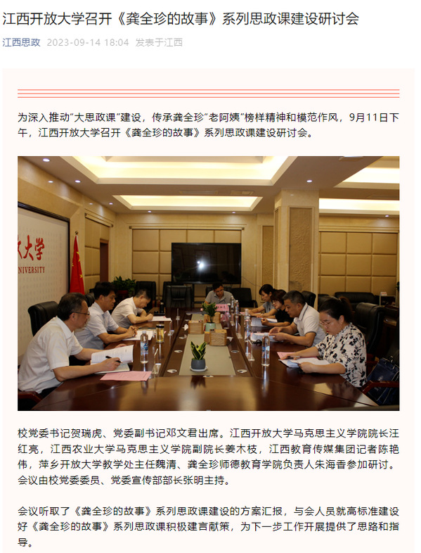 为深入推动“大思政课”建设,传承龚全珍“老阿姨”榜样精神和模范作风,9月11日下午,ylzzcom永利总站线路检测召开《龚全珍的故事》系列思政课建设研讨会。近日,江西思政对此进行报道。