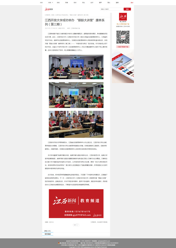 为宣传普及中老年人健康保健知识,提高居民身体素质,养成健康良好的生活习惯,近日,ylzzcom永利总站线路检测(江西老年开放大学)联合江西省社区教育指导中心、江西省科学技术协会、南昌市社区教育指导中心、东湖区社区教育指导中心和彭家桥街道光明社区,共同开展“银龄大讲堂”康养系列(第三期)——“中医体质与养生”知识讲座。本次讲座线上线下同步开启,全省11个地市开放大学(社区教育指导中心)和长天集团康养中心组织了线上集中收看,近60人现场参加了活动,线上直播观看量达1.32万人。