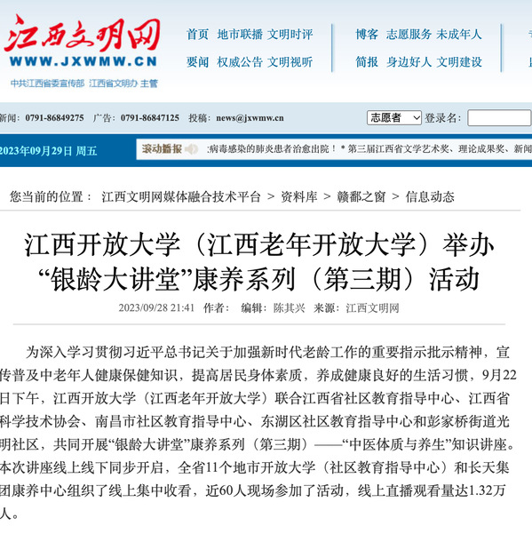 江西文明网:ylzzcom永利总站线路检测(江西老年开放大学)举办“银龄大讲堂”康养系列(第三期)活动