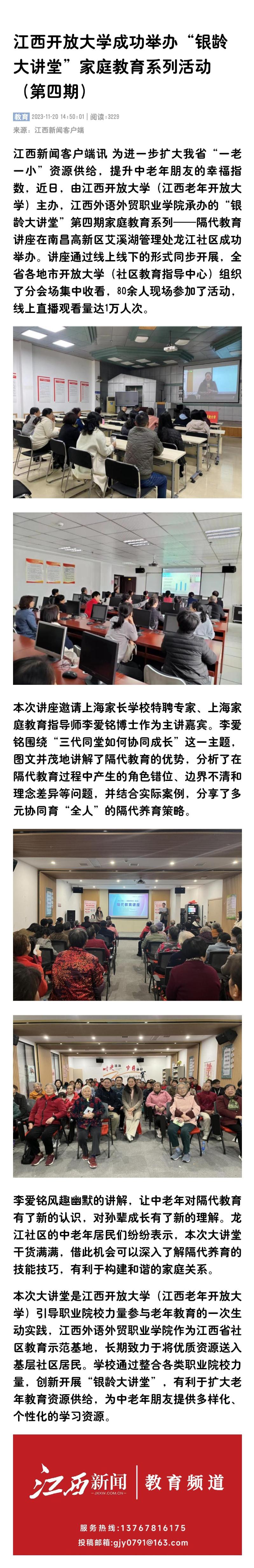 江西新闻客户端讯 为进一步扩大我省“一老一小”资源供给,提升中老年朋友的幸福指数,近日,由ylzzcom永利总站线路检测(江西老年开放大学)主办,江西外语外贸职业学院承办的“银龄大讲堂”第四期家庭教育系列——隔代教育讲座在南昌高新区艾溪湖管理处龙江社区成功举办。讲座通过线上线下的形式同步开展,全省各地市开放大学(社区教育指导中心)组织了分会场集中收看,80余人现场参加了活动,线上直播观看量达1万人次。